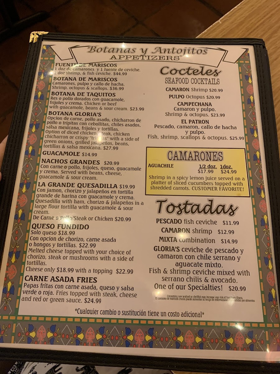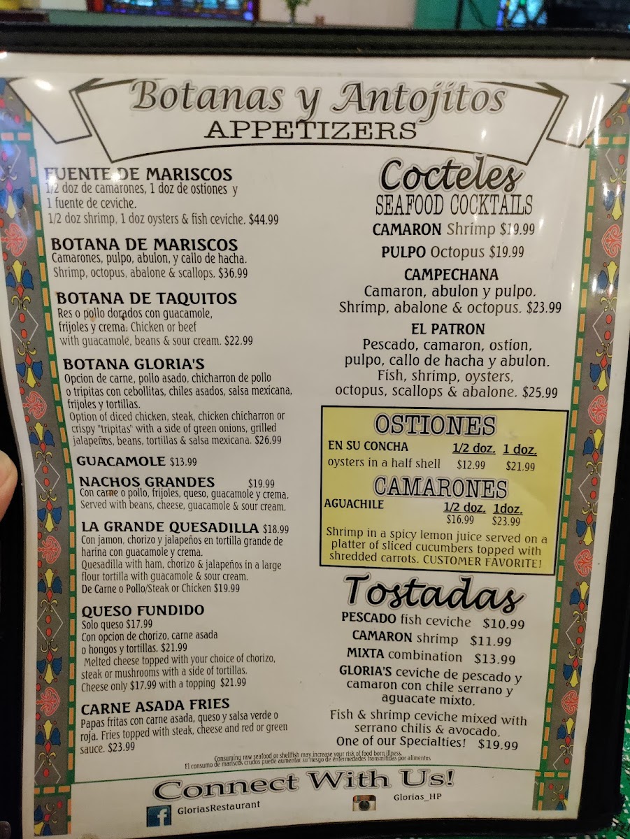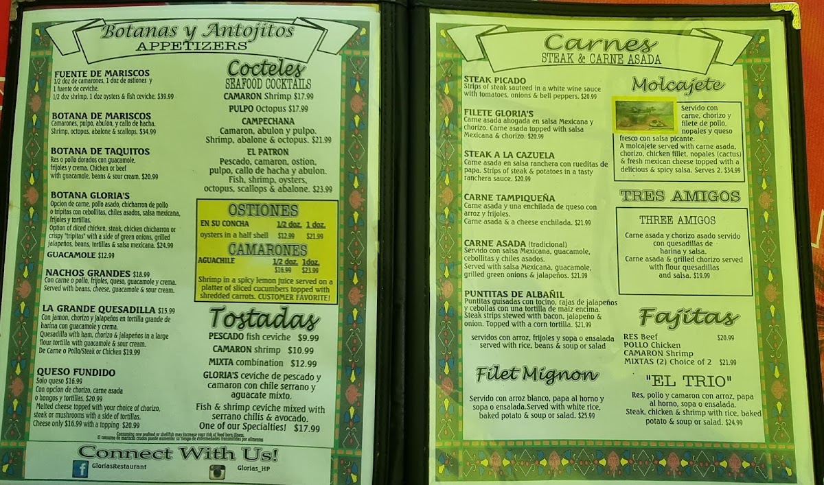 The menu’s strength lies in balancing traditional flavors with fresh, high-quality ingredients. From the savory elegance of Carne Asada and Mole to the mixed Parrillada hot plate brimming with grilled seafood and tender meats, every bite is a celebration. Friendly service and warm ambiance make tasting these dishes a memorable experience. Gloria’s feels like home with every savory, perfectly seasoned dish.